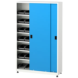 Sliding Door Cabinet with 42 Plastic Bins